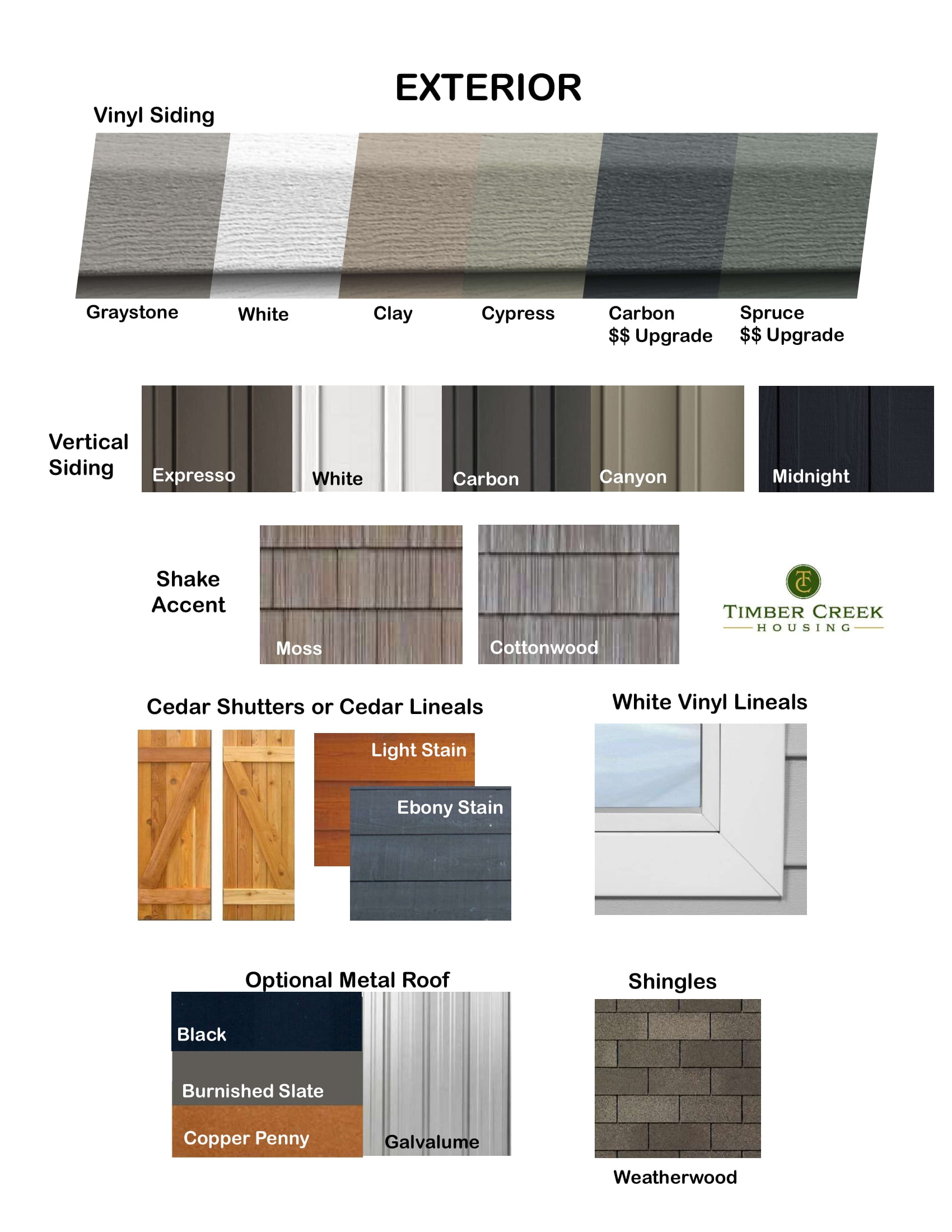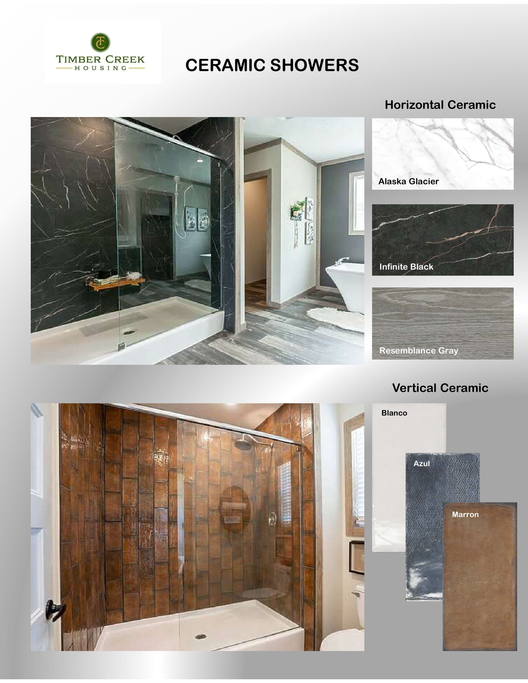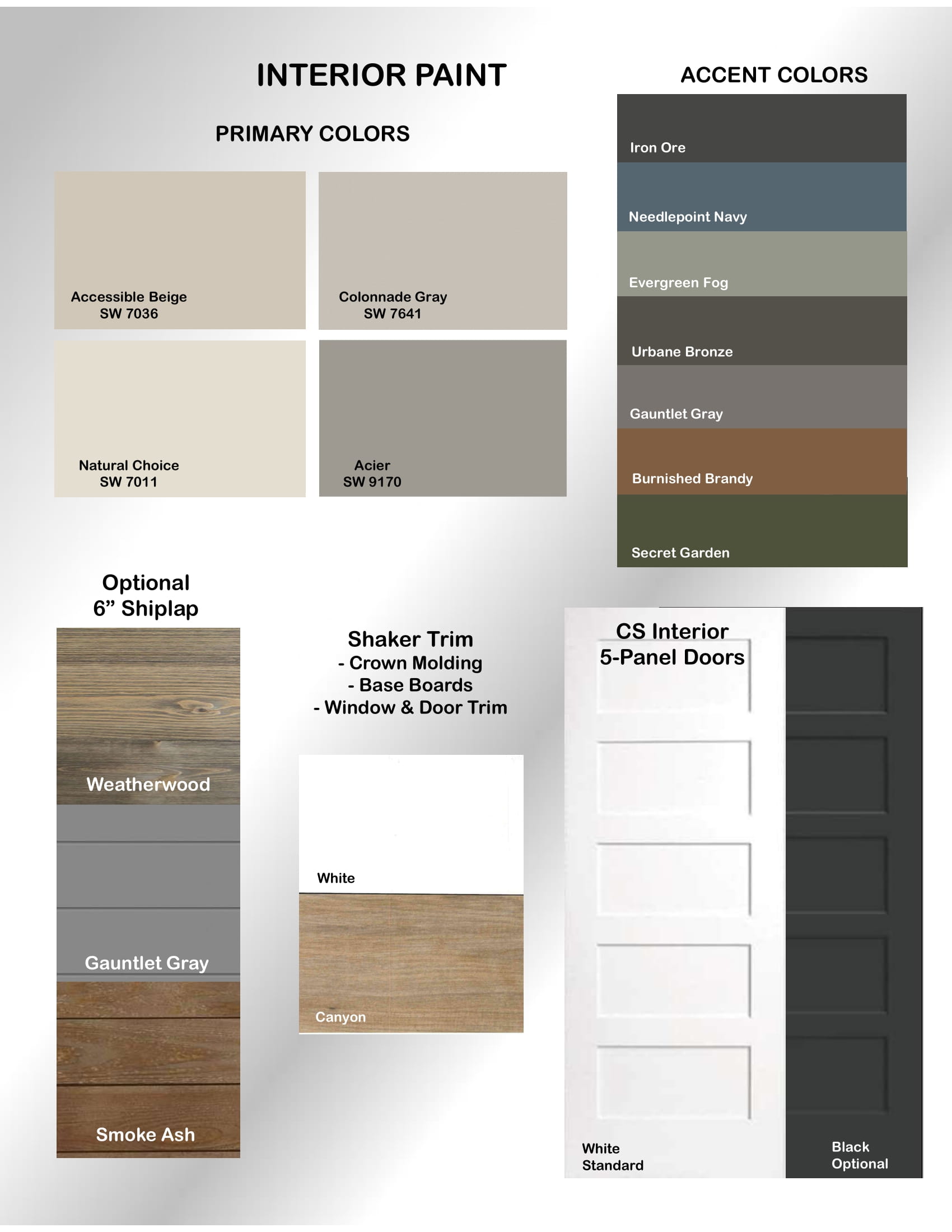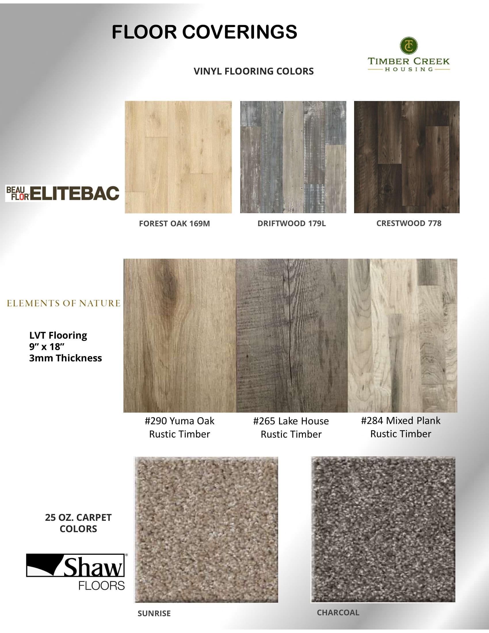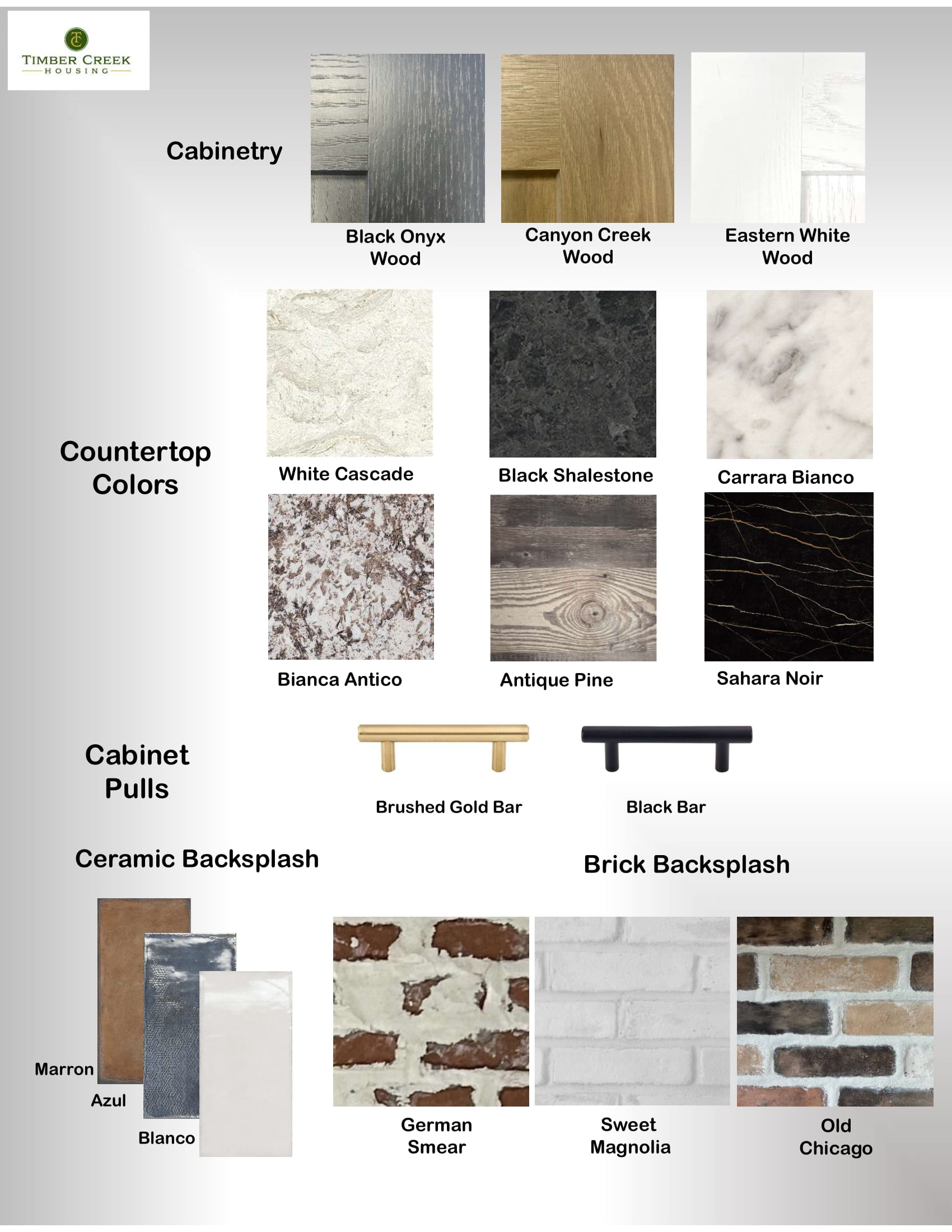 At Summit Homes by Timberline, our décor board lets you personalize every detail of your new Timber Creek home. Choose from a wide mix of countertops, cabinets, flooring, fixtures, colors, and finishes to match your style. Whether you lean modern, rustic, or classic, our curated selections make it easy to design a factory-built home that feels truly your own.